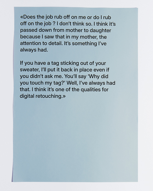 In a world where digital retouching is ubiquitous and increasingly automated by artificial intelligence, human gestures still persist, those of the retouchers. Skin, hair, enamel and details are shaped with meticulous precision. It is these small, repetitive actions, performed daily, that transform the images. This project captures the slow, deliberate pace of this work, far from the speed associated with technology.