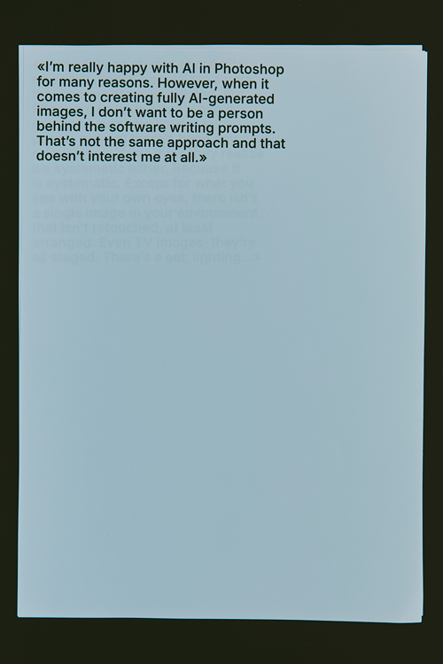 In this universe dominated by growing automation, what space remains for slowness, humanity, and the ordinary ? Behind this artisanal practice, a paradox emerges : how can the art of gesture, which seeks perfection, coexist with the impact of alterations made to the images, in a society where the modification of reality raises new questions.
